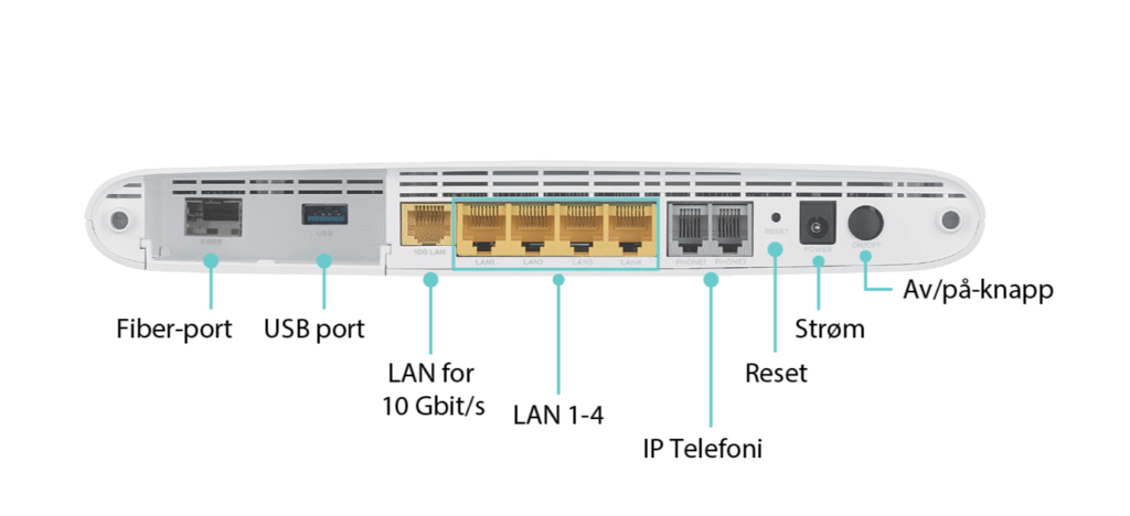 - LAN 1-4: Elektronisk utstyr tilkobles hjemmesentralen ved å bruke av de fem gule LAN-portene og Ethernetkabel. Dette kan være PC, spillkonsoll, WiFi eller TV-dekoder.